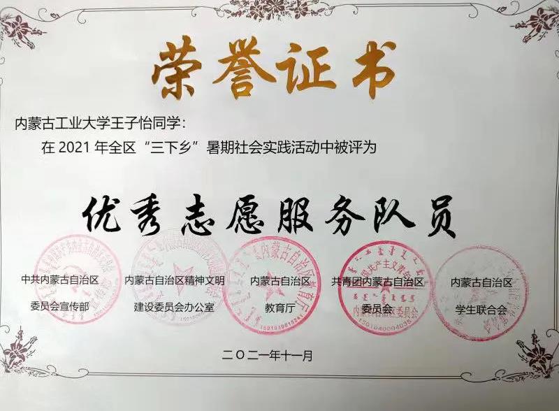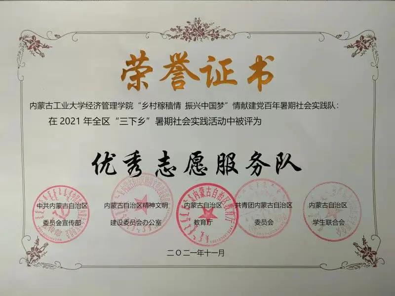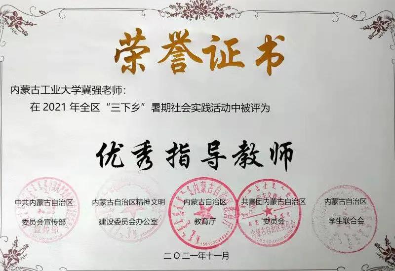 在此次活动中,由冀强,方英,贾国辉三位老师指导的“乡村稼穑情 振兴中国梦”情献建党百年暑期社会实践队获得自治区“优秀志愿者服务队”荣誉称号。公司党委副书记、副经理冀强老师获得“优秀指导教师”荣誉称号,财管19-2班王子怡同学获得自治区“优秀志愿者服务队员”荣誉称号。