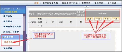 教师登录教务系统,点击“调课管理”,在“调课申请”中点击对应事项按钮。