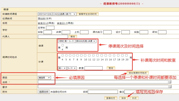 以调课为例,选择待调课程;停课周、星期和节次;补课周、星期和节次及教室;点击“添加调课时间地点”按钮;选择调课“原因”、填写调课“说明”,并上传证明材料后保存。