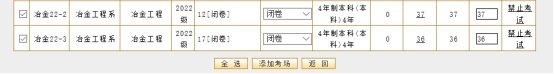 根据考场容量来选择班级,一般一个考场的容量小于80人。重修员工的课序号是610——617。在安排班级时,将重修生安排在一起,正常班安排在一起。选择班级后,点击下方的【添加考场】按钮,进入步骤四(※重修生较多的公共课程,可选择【按课程班排】,将重修班安排后,安排正常班时会方便和高效)。