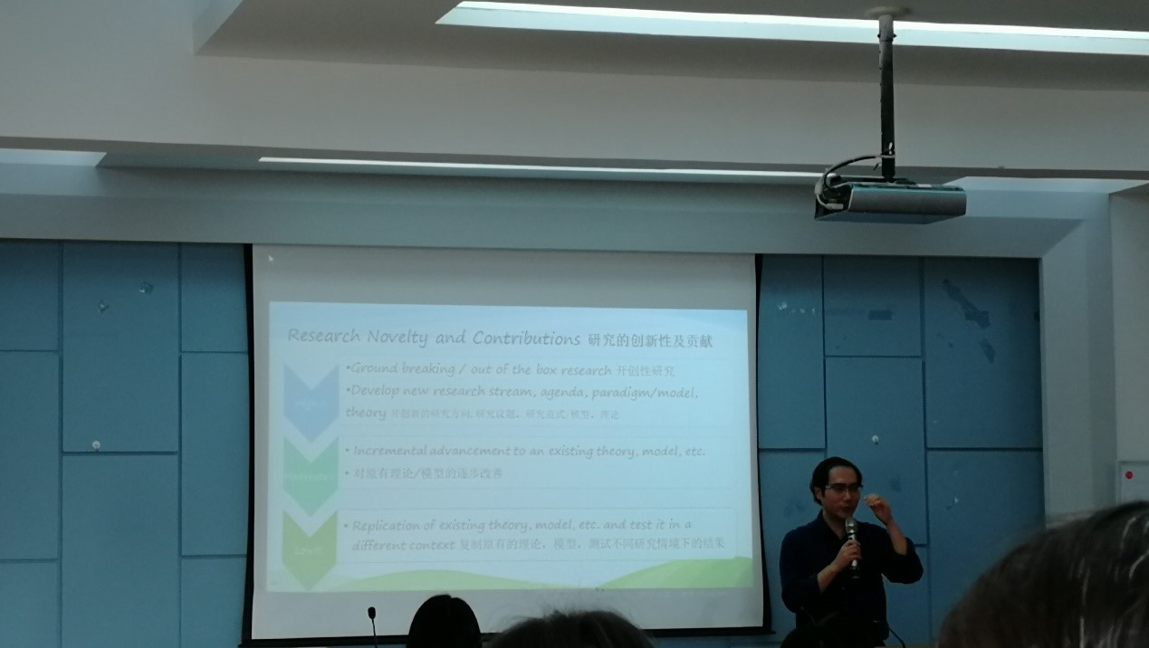 在讲座最开始黄教授向我们介绍了论文写作中常见的问题和困惑,指出我们做学术研究既要关注研究选题的新颖性又要考虑其是否可行。在做学术研究之前,要综合考虑时间、个人兴趣、未来规划等要素以找到新颖性和可行性的平衡点。接下来要进行有效的数据收集,在此,黄教授分别向我们介绍了定性研究与定量研究的优缺点。最后,黄教授以发表的“美食自拍”主题的论文为例向我们介绍了做出一篇好论文需要的八个步骤。