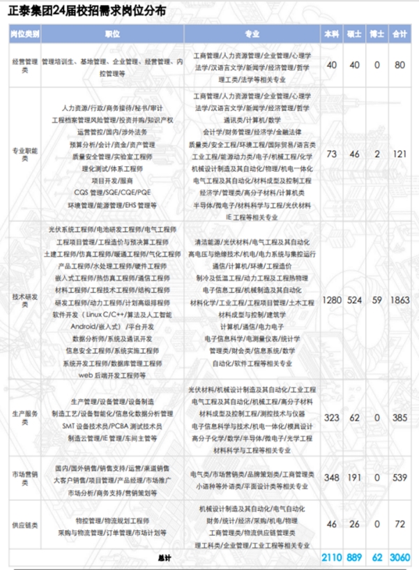 正泰集团计划招聘全国及海外2024届本科、硕士、博士应届毕业生共计3060人,具体需求详见下表(正泰集团24届校招需求岗位分布)