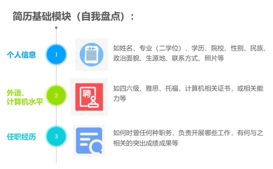 4.简历模块、条目的具体顺序也要因单位招聘要求而定。目标单位、岗位的招聘要求首先强调什么,就先展示什么;最重视什么,就把什么放在前面。