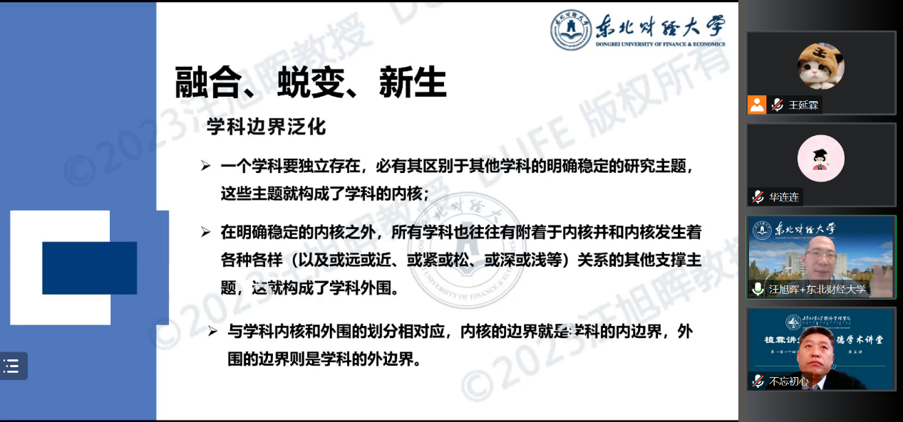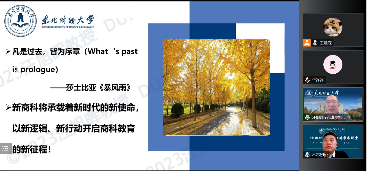 2023年2月15日,伟德官方网站举办“植霖讲堂·第一百一十四讲”暨“励德学术讲堂·第五讲”——《融合、蜕变、新生:新商科建设的若干思考》主题讲座,讲座由东北财经大学副董事长、博士生导师汪旭晖教授主讲。祁龙老师主持会议。