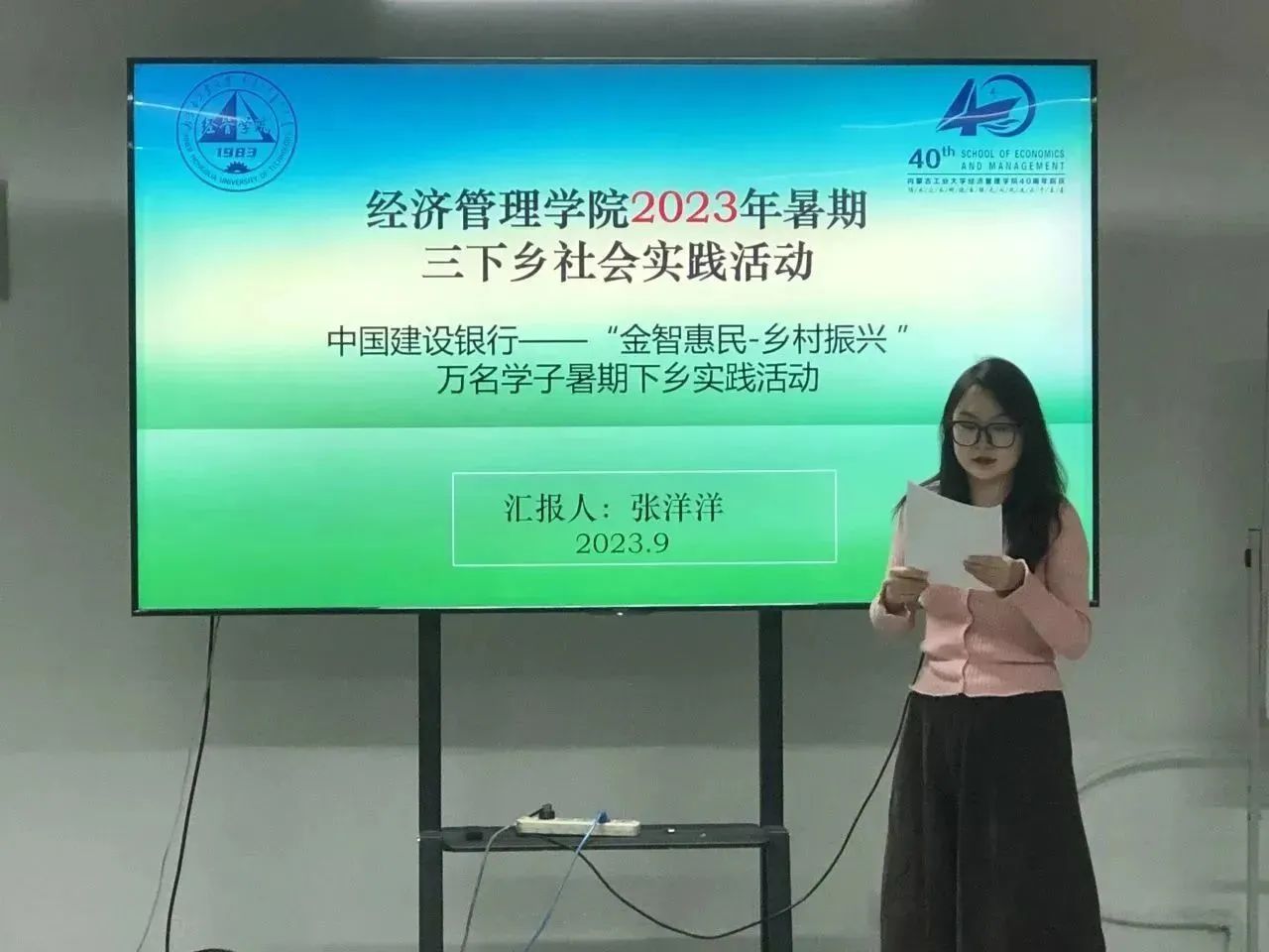 员工代表金鑫,张洋洋,王晨宸,李威升结合赴建设银行内蒙古自治区各支行开展“专业+”暑期社会实践,赴察右中旗巴音乡开展“3+4+5”暑期社会实践,参加财政部全口径债务监测平台建制县试点债务化解志愿工作等系列实践活动,分别分享实践感悟和体会。