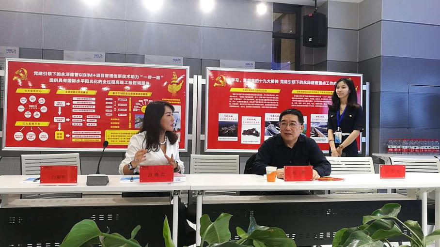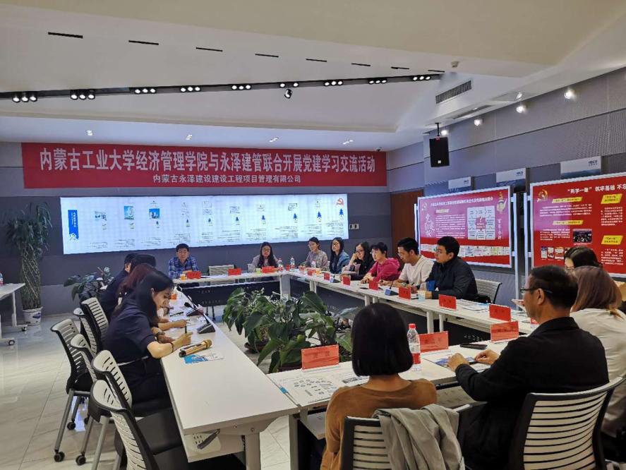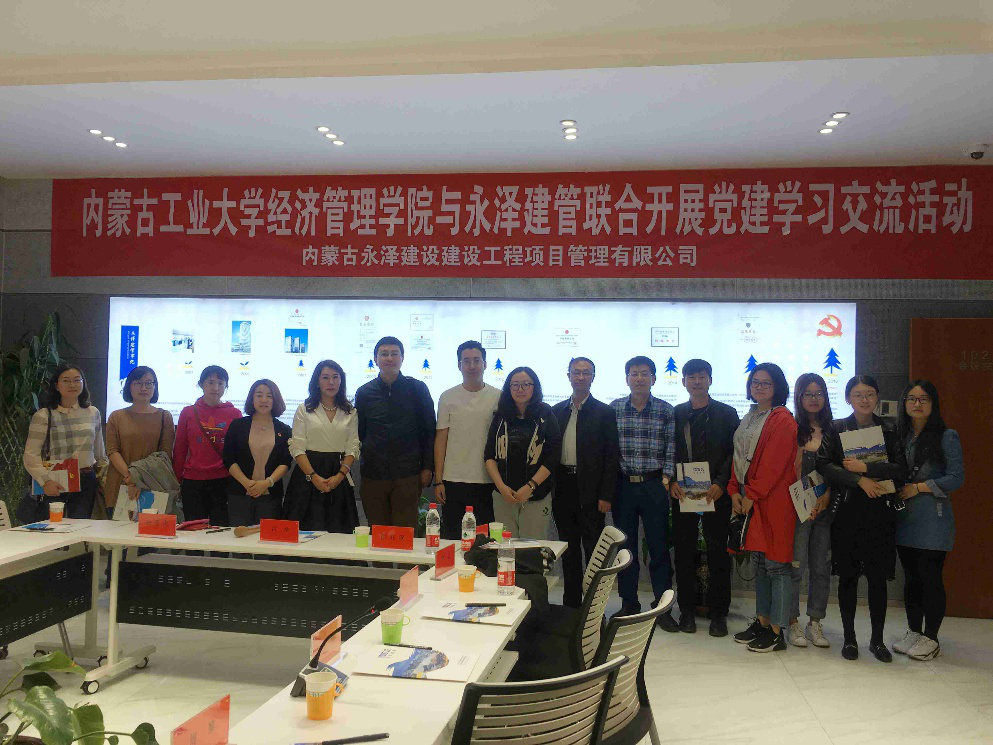 2018年4月19日上午10点,信息与电商系党支部书记张璐老师组织系内党员、老师、研究生共14人,对内蒙古永泽建设工程项目管理有限公司进行了党建经验交流座谈会。首先,永泽公司董事长万晓红对作为非公企业进行党建的初衷、历程、作用进行了详细的介绍,万晓红指出“应当让企业文化和党的思想紧密结合,使企业员工将党的思想作为一种人生信仰”,并通过建立党史长廊、永泽建管非公党建好声音APP、一岗双责制度、“两学一做”、业余党校等党建工作促进企业发展,进而构造出集PPP项目咨询、招标代理、造价咨询、BIM技术、全生命周期项目管理五大业务板块的高端技术咨询服务企业。