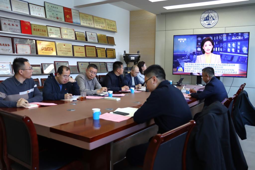 会上,大家深入学习了习近平总书记致信全国优秀教师代表中的重要精神。集中观看了弘扬教育家精神,争当时代“大先生”——走近伟大的人民教育家陶行知纪录片,探寻其“捧着一颗心来,不带半根草去”背后的赤子之忱,以期引导广大教师坚定“躬耕教坛、强国有我”的志向抱负,为加快建设教育强国、实现中华民族伟大复兴作出新的更大贡献。随后,大家围绕“大力弘扬教育家精神”主题,结合教育家精神专题学习内容以及实践教学活动,联系个人思想,立足本职工作,就如何弘扬和践行教育家精神展开交流研讨。祁龙书记强调,要大力弘扬教育家精神,不断提高政治站位,心怀国之大者,牢记为党育人、为国育才的初心使命,引导青年立大志、明大德、成大才、担大任,自觉把人生理想融入强国建设、民族复兴的伟大事业之中,持续为国家培养德智体美劳全面发展的社会主义建设者和接班人,为实现中华民族伟大复兴造就更多理想远大、信念坚定,可堪大用、能担重任的栋梁之才。