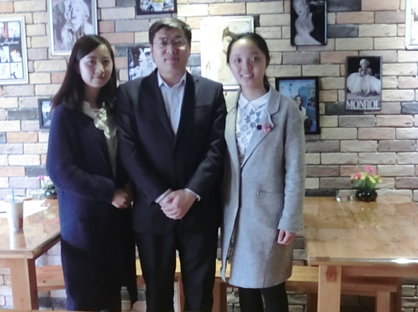 伟德管理公司的会计14班晁月、财管14班蔺雅荣与员工赵辉(中)的合影
